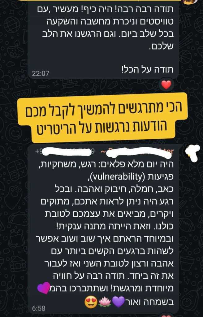 כן, הריטריטים שלנו מתאימים לדתיים – האוכל והכלים כשרים. בחלקים שכוללים שירת נשים הכנו את אותה פעילות מוקלטת ללא שירת נשים, כך שכל אחד יוכל לכבד את אמונתו. לשמחתנו מגיע אלינו המון קהל של דתיים, חרדים ורבנים וזה מרגש אותנו שאפשר למצוא ביחד את הגם וגם במקום לוותר על עצמינו או לוותר על המפגש – ממש כמו בזוגיות.